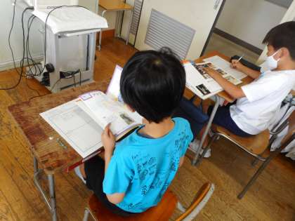 3年生から総合的な学習の時間が始まりました。自分の興味のある国について、本を使って調べています。