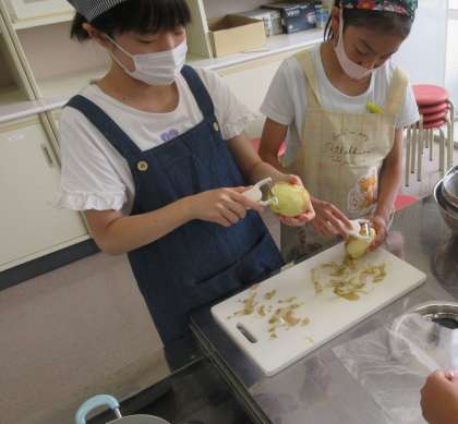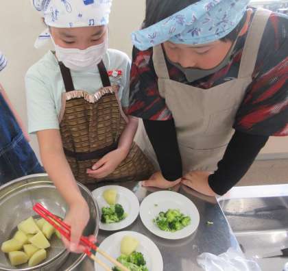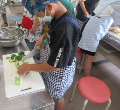 家庭科の学習で調理実習をしました。包丁の使い方や野菜のゆで方等、グループで協力しながら取り組みました。盛り付けた後はおいしくいただきました。