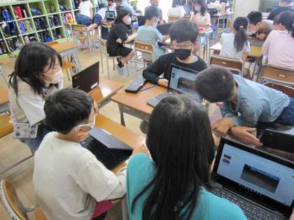国語科の学習で、アップとルーズについてスライドにまとめ、グループ内で発表し合いました。発表後は、活発に意見を交流し、感想をノートに書きました。