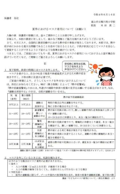 本日、ご家庭に夏季のマスク着用に関するお願いを配付しました。