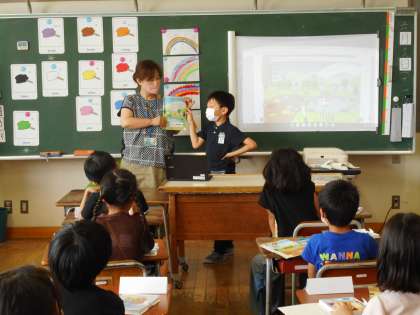 外国語の学習で、すきな色を伝え合いました。「This is my rainbow.」と自分の描いた虹を見せながら発表していました。