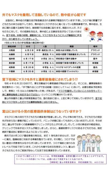 今回の富山市立学校新型コロナウイルス感染症対策会議だよりは、登下校時、体育の時間、運動時のマスク着用における危険性について記されています。右の配布文書からご覧になることができますので、必ずご一読ください。