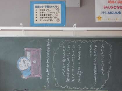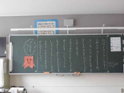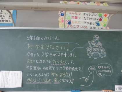 始業式に向けて、各学級の黒板には、担任から子供たちへメッセージが記されています。