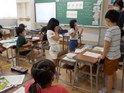 まつ虫やくつわ虫などの秋の虫の鳴き声を手拍子で表現し、リズムの違いを楽しんでいます。