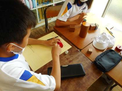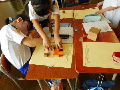 今までに学習した形を利用して、様々な絵を描いています。知っている形を組み合わせたり重ねたりして工夫しています。