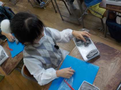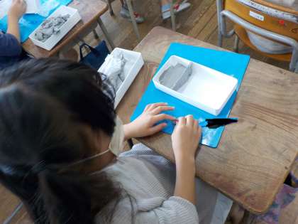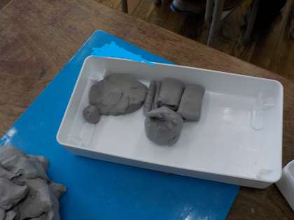 遠足やいろいろな場面でお弁当を作ってもらっていることを振り返り、「お家の人にお弁当をつくるなら」とテーマを決めて、ねんどで作りました。