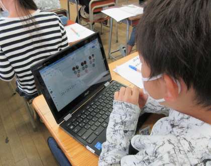 かけ算の学習をしています。一人一台端末を使って考えをまとめたり、グループで話し合ったりしています。