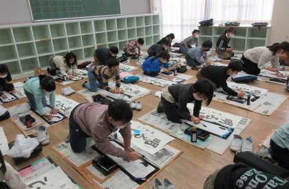 書き初めの練習が始まりました。初めての大きな紙での毛筆に挑戦しています。
