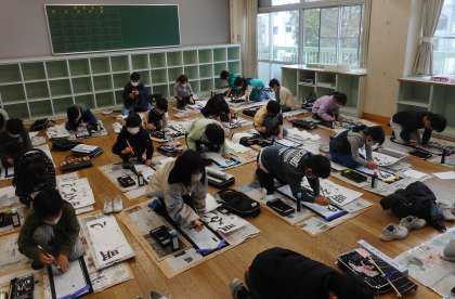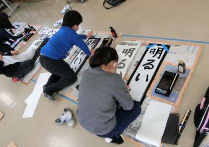 初めての毛筆での書き初め大会でした。練習の成果を発揮しようと、一字一字丁寧に書いていました。