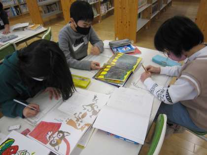 国語科「自分だけの詩集を作ろう」の学習で、図書室に行って詩の本を読み、テーマを決めてお気に入りの詩を視写しました。