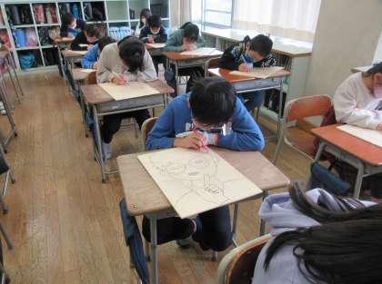 図画工作科の学習で版画を作成しています。初めての彫刻刀に緊張しながらも、がんばっています。