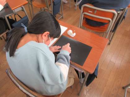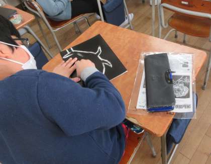 「消してかく」の学習では、砂消しゴムを使って、黒いボードを削っていくことで描いています。消しゴムの使い方によって、いろいろな工夫ができそうです。