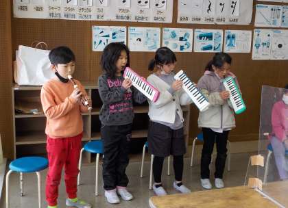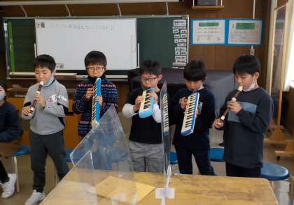音楽の学習で、アンサンブル発表会がありました。「ゆかいな木きん」をグループごとに工夫して演奏しています。