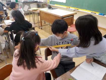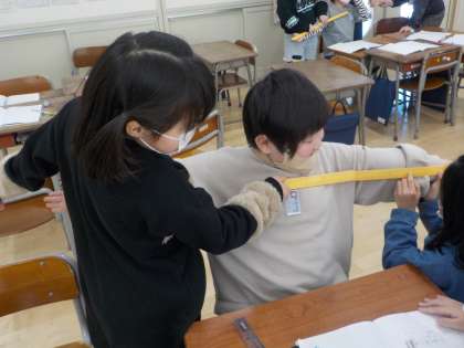 算数の時間に手の大きさや腕を広げた長さを調べました。グループで30センチものさしを持ち寄り、協力して測っていました。