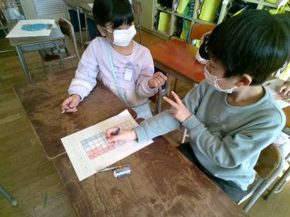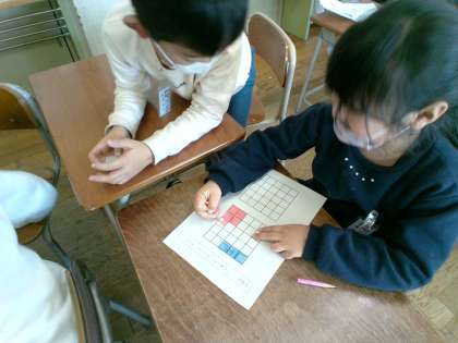 算数科「どちらがひろい」の学習で、陣取りゲームをしました。じゃんけんで勝つと、自分の色を1ます分塗ることができます。「私の方が○○ますぶん多いから私の勝ち!」など、楽しみながら広さの学習を行いました。
