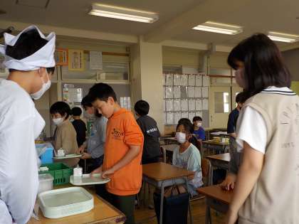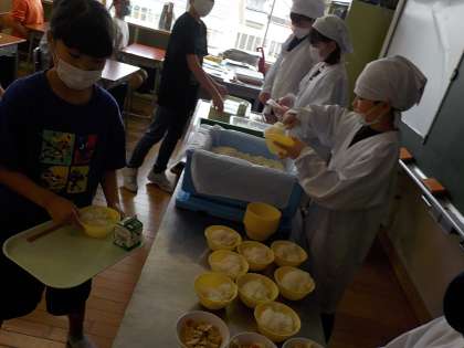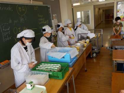 静かに落ち着いて給食の準備をしています。整然と並び、配給ができる五年生です。