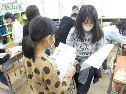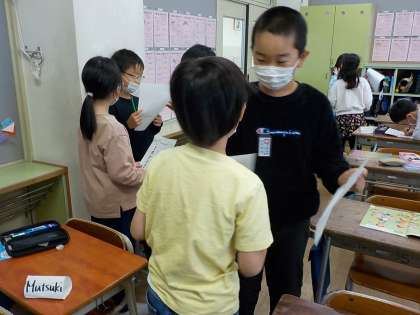 外国語活動の時間では、「How are you?」「I'm 〜」と相手の調子を聞いたり、自分の調子を答えたりする学習をしました。多くの友達に積極的に話しかけ、コミュニケーションを楽しんでいました。