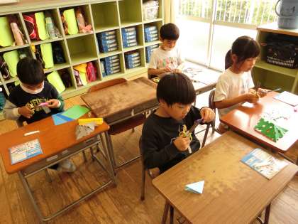 折り紙を折ったり、重ねたりして、はさみで切りました。