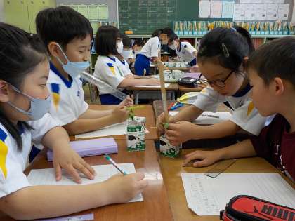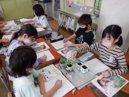 先日まいたホウセンカ、ヒマワリ、オクラ、ピーマンの種から子葉が出ました。色や形をよく観察して、似ているところや違うところを比べたり、ものさしで大きさを測ったりしてワークシートに記録しました。「わたしのヒマワリ、こんなに大きいよ」「茎が長いから支柱をたてようかな」とうれしそうに話す子供たちでした。