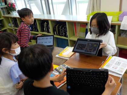社会科の学習では、富山県の地形の特色や産業、市町村等について調べてきたことをまとめて、グループのメンバーに発表しました。