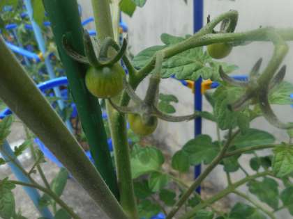 子供たちが一生懸命にお世話をしているミニトマトの様子です。花が咲き、実がなってきています。