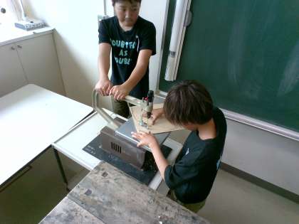 図画工作科で、電動糸のこを使った作品作りをしました。初めての糸のこに緊張しながら、慎重に切っています。