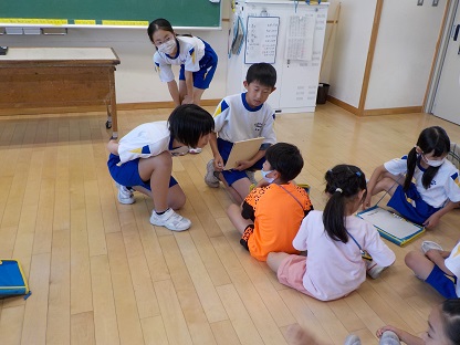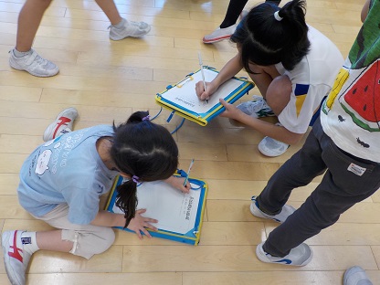 堀南タイムに1回目のふれあい活動が行われました。6年生が中心となって、ふれあい班の目当てを決めたり、班のみんなとサイン交換をしたりして親睦を深めました。