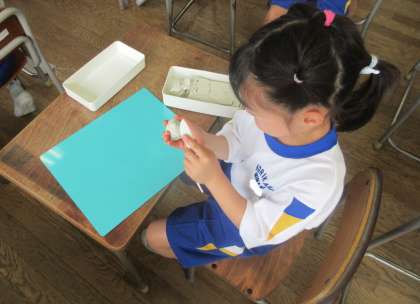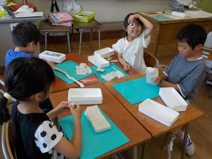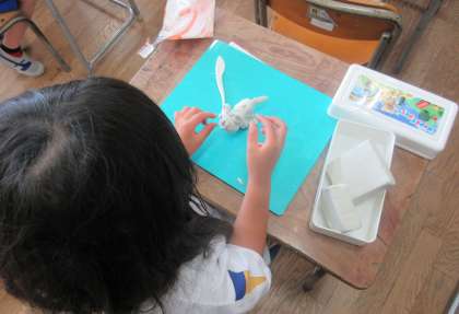 図画工作科の学習では、ねん土を使って好きな動物を作ったり、ひも状に伸ばして色々な形を作ったりしました。