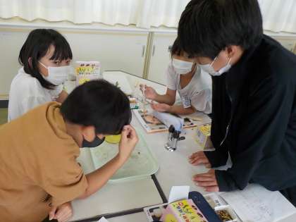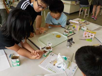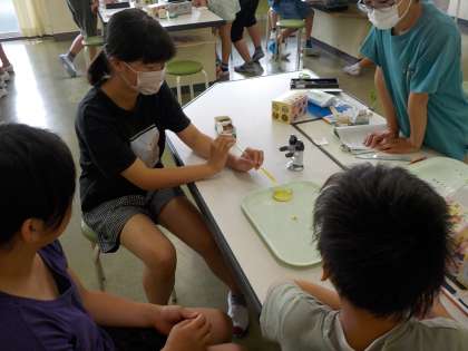 種の中身について考えました。断面を観察したりヨウ素液を垂らしたりして、種の中身が成長になくてはならないものである、と考えを深めていました。