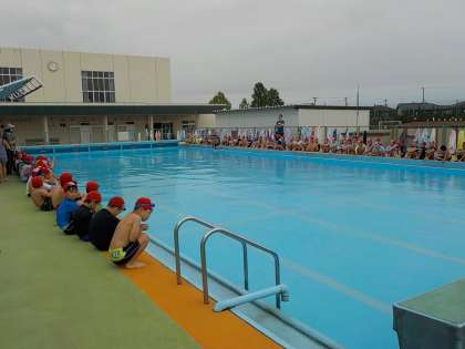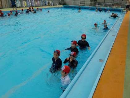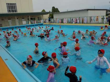 プールで学習する際の約束や入り方を確認した後、プールの中をぐるぐると歩くなど、水に慣れる運動を行いました。