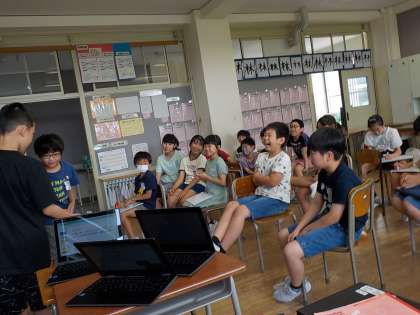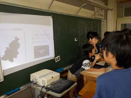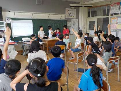 クラスでお楽しみ会を開きました。今月は4つの係がクイズやゲームを用意し、みんなで楽しみました。