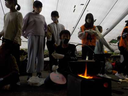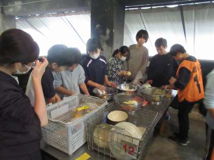 野外炊飯でカレー作りをしました。第1炊飯棟の様子です。
