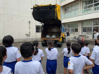 初めてごみ収集車を間近で見た子供たちは、その仕組みに驚いていました。