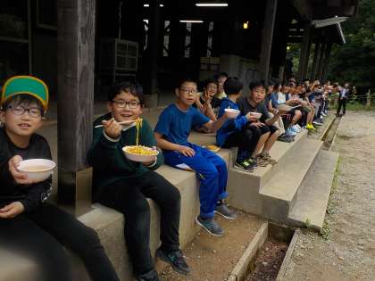 みんなで野外炊飯をしました。子供たちは、暑い中、火を起こし、灰と戦いながら、とても美味しい焼きそばを作ることができました。