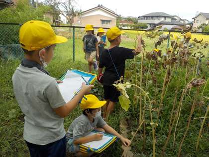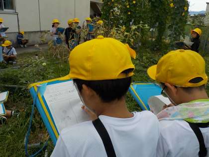 5月に植えたヒマワリ、オクラの実や種ができ、観察をしました。