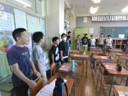 朝の歌の時間に、5年生は、連合音楽会の歌を歌っています。子供たちは、少しずつ自信をつけ、美しい歌声を響かせています。