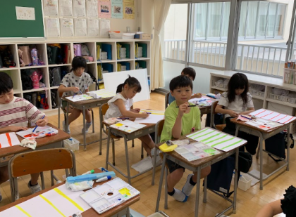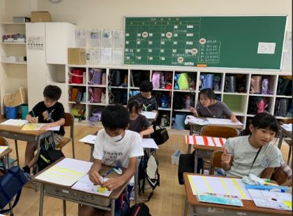太い線、細い線を使ってしまもようのシャツを描いています。筆をまっすぐに運ぶという難しい作業です。どんなシャツができあがるのか楽しみです!