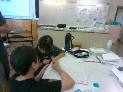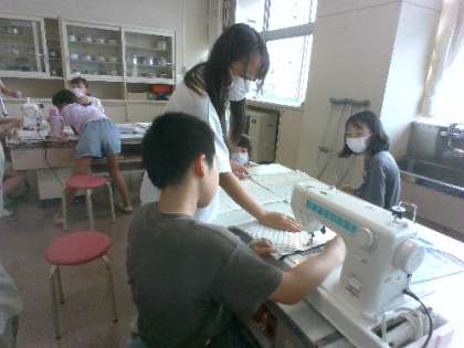 ミシンを使ってナップサックづくりをしています。手順を一つ一つ確認しながら、友達と協力して制作しています。