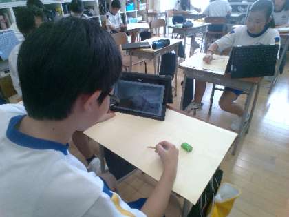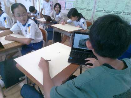 6年間の思い出が詰まった校舎の絵を描いています。構図を考えて、細かいところをよく見て、遠近感が出るように丁寧に取り組んでいます。