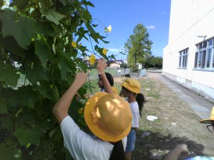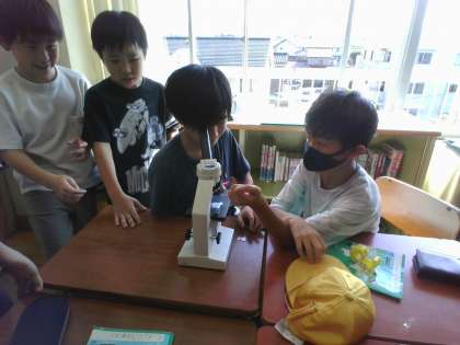 おしべの先についている花粉を観察しました。セロハンテープで集めた花粉を顕微鏡で観察しました。顕微鏡の使い方にも慣れてきました。