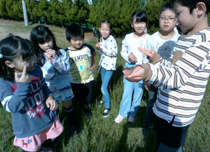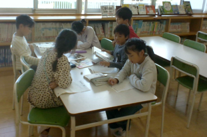 生活科「生きものと友だち」の学習では、図書室の本で虫について調べたり、実際に学校のグランドや昆虫王国に行って虫探しをしたりしています。