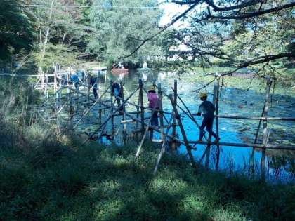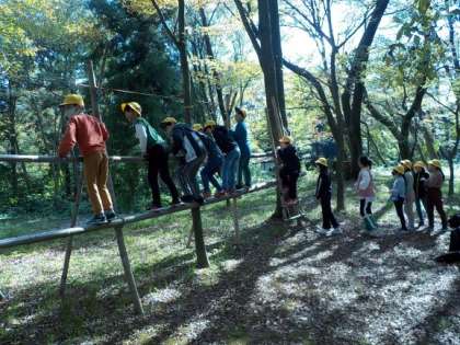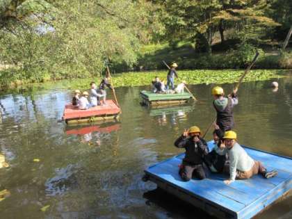 池遊びではいかだにのったり、竹で出来た橋を渡ったりしました。普段は出来ない体験をたくさんすることができました。