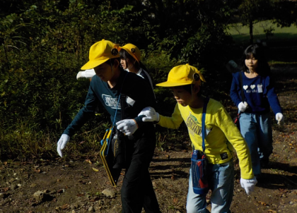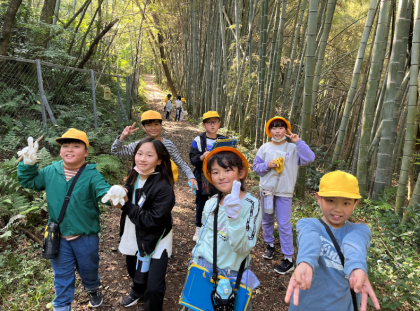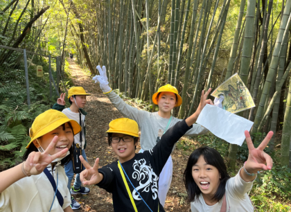 班のみんなと一緒に森の中を歩いてポイントを見つけ、たくさんの自然にふれ合いました。