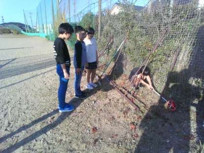 算数科の学習では、グラウンドの面積を測るために、様々な図形の面積の求め方について学習してきました。今日は、今まで学んだことをもとにグラウンドの面積を実際に測り、面積を求めました。仲間で協力して「はやく」「正確に」「かんたんに」求められるよう頑張りました。