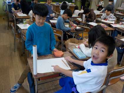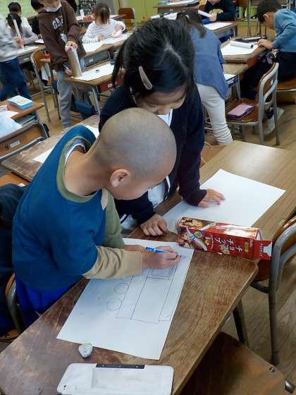 算数科の学習で今まで使ってきた箱の形を利用して、絵を描きました。箱の向きを変えて、いろいろな形があることを見つけながら、楽しそうに活動していました。