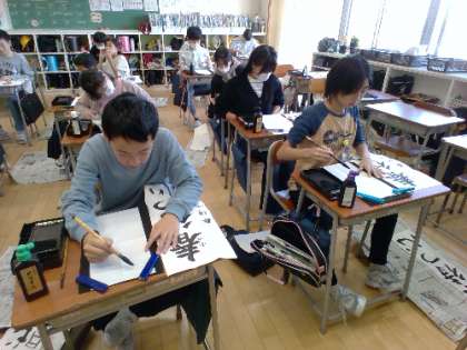書き初めの練習を始めました。整った字を書くために、お手本をよく見て真剣に書いています。