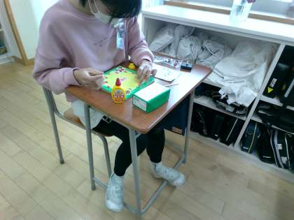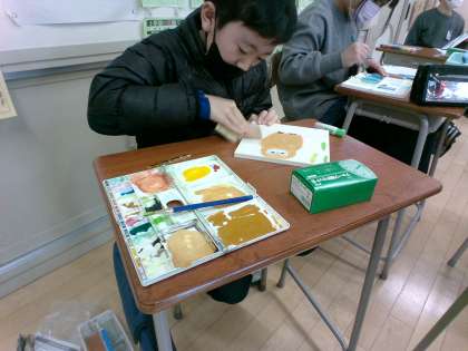 図画工作科では、掛け時計のデザインに合わせて、彫刻刀で掘ったり、色合いを考えて塗ったりしています。