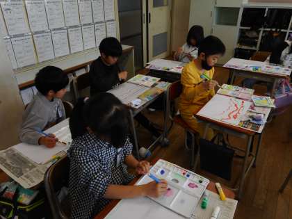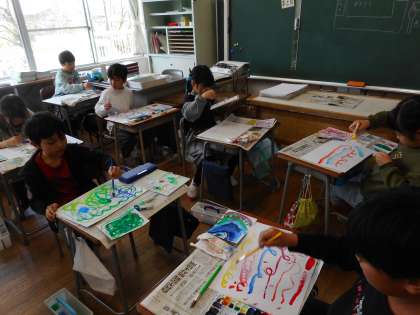 図工では、「絵の具+水+筆=いいかんじ!」で水の量や筆の太さなどの違いを感じながら楽しみました。