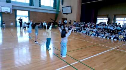 「入学おめでとう集会」があり、1年生の前で、ツバメを踊りました。練習をしてきましたが、いざ入場となると「緊張する」とドキドキしていた2年生です。しかし、会場からも大きな手拍子をもらい、緊張をはねのけて楽しく踊ることができました。