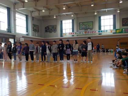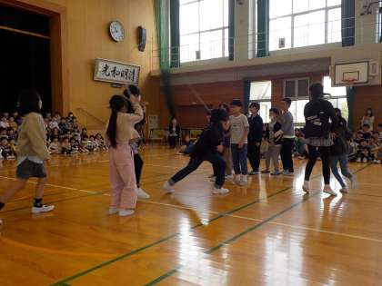 入学お祝い集会では、長縄八の字跳びとダンスを元気いっぱいに披露しました。